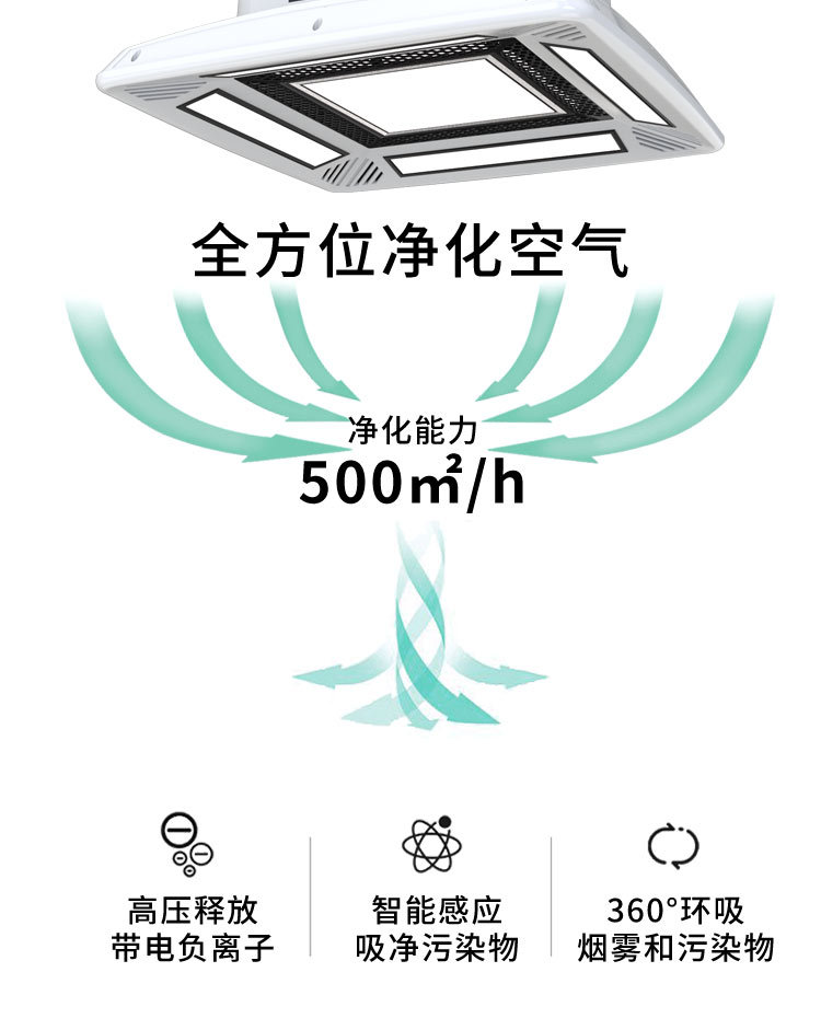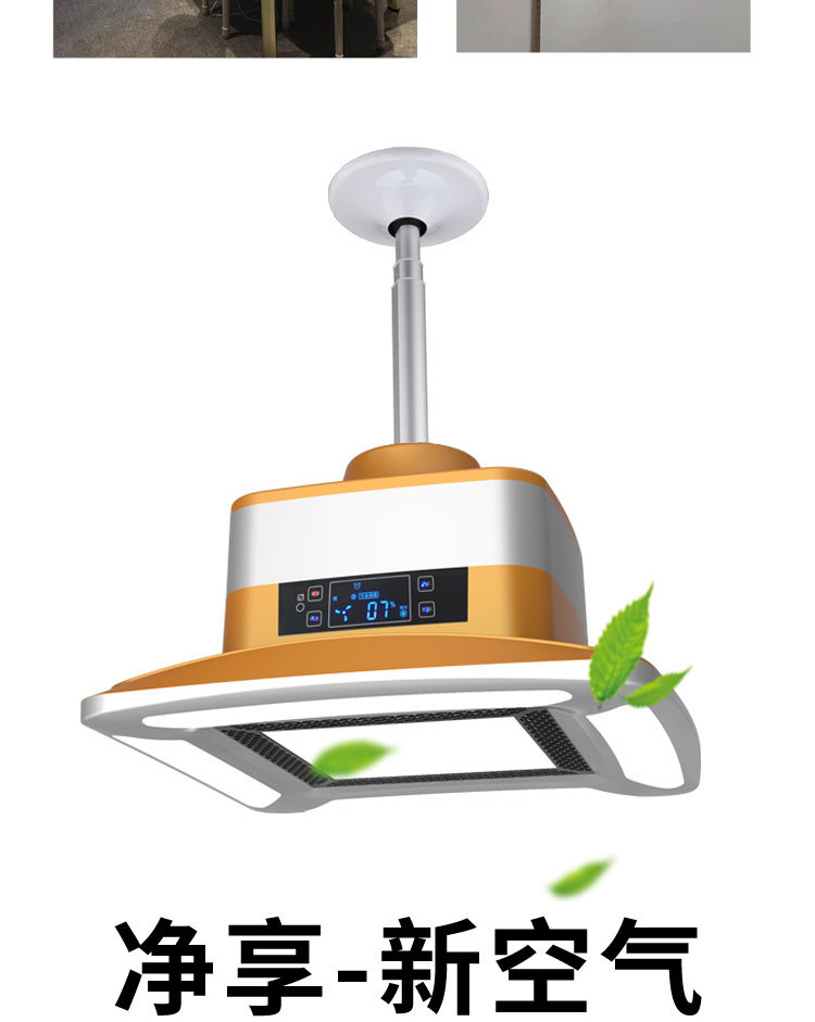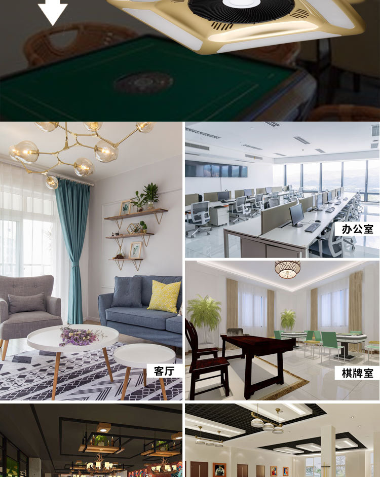 麻將館、棋牌室適用,能有效地消除室內空氣中的煙塵、煙霧(有效地預防“二手煙”對人身體的危害)及室內裝修產生的有害氣體。集空氣凈化、照明、裝飾于一體。